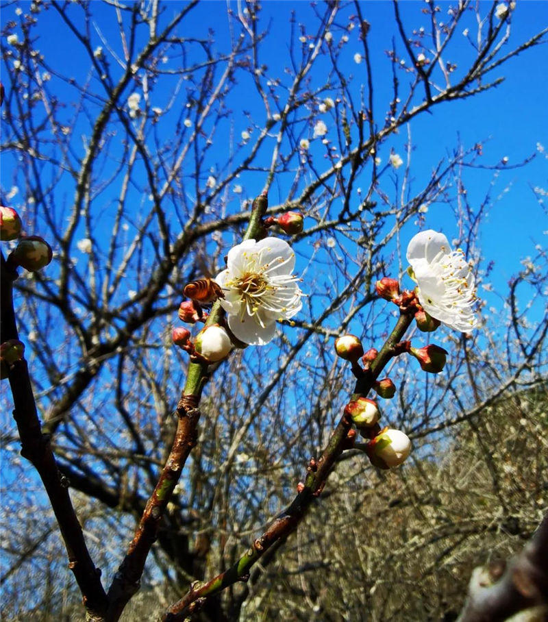 八寨溝梅園四周青山環(huán)繞,鳥(niǎo)語(yǔ)花香,當(dāng)梅花盛開(kāi)時(shí),漫山遍野的梅花與青山綠水交相輝映,宛如世外桃源;當(dāng)你置身其中,極目望去,朵朵梅花在艷陽(yáng)冷風(fēng)中傲然綻放;遠(yuǎn)望,一樹(shù)繁花似錦如雪,近賞,朵朵白梅挺立枝頭,小巧的花瓣,精致的花蕊,潔白無(wú)瑕,成群的蜜蜂在花間縈繞。