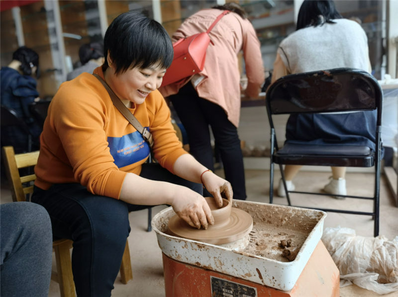 坭興陶文化體驗(yàn)活動(dòng)分為文化知識(shí)講解和制作體驗(yàn)兩部分。文化館負(fù)責(zé)人詳細(xì)講解欽州市泥興陶歷史文化、成就,并帶領(lǐng)女職工們參觀陶器燒制現(xiàn)場(chǎng)和泥興陶成品,介紹泥興陶制作過(guò)程以及煙塵處理等知識(shí)。在陶藝制作體驗(yàn)環(huán)節(jié),女職工們認(rèn)真觀摩陶藝?yán)蠋煹牟僮餮菔纠吆偷窨?,并有模有樣的制作,雖然制作出來(lái)的作品相對(duì)粗糙,但大家如獲至寶。
