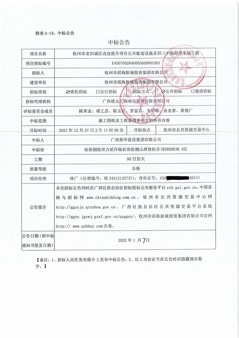 中標(biāo)公告-欽州市老舊城區(qū)改造提升項目公共配套設(shè)施及舊三中臨時停車場工程