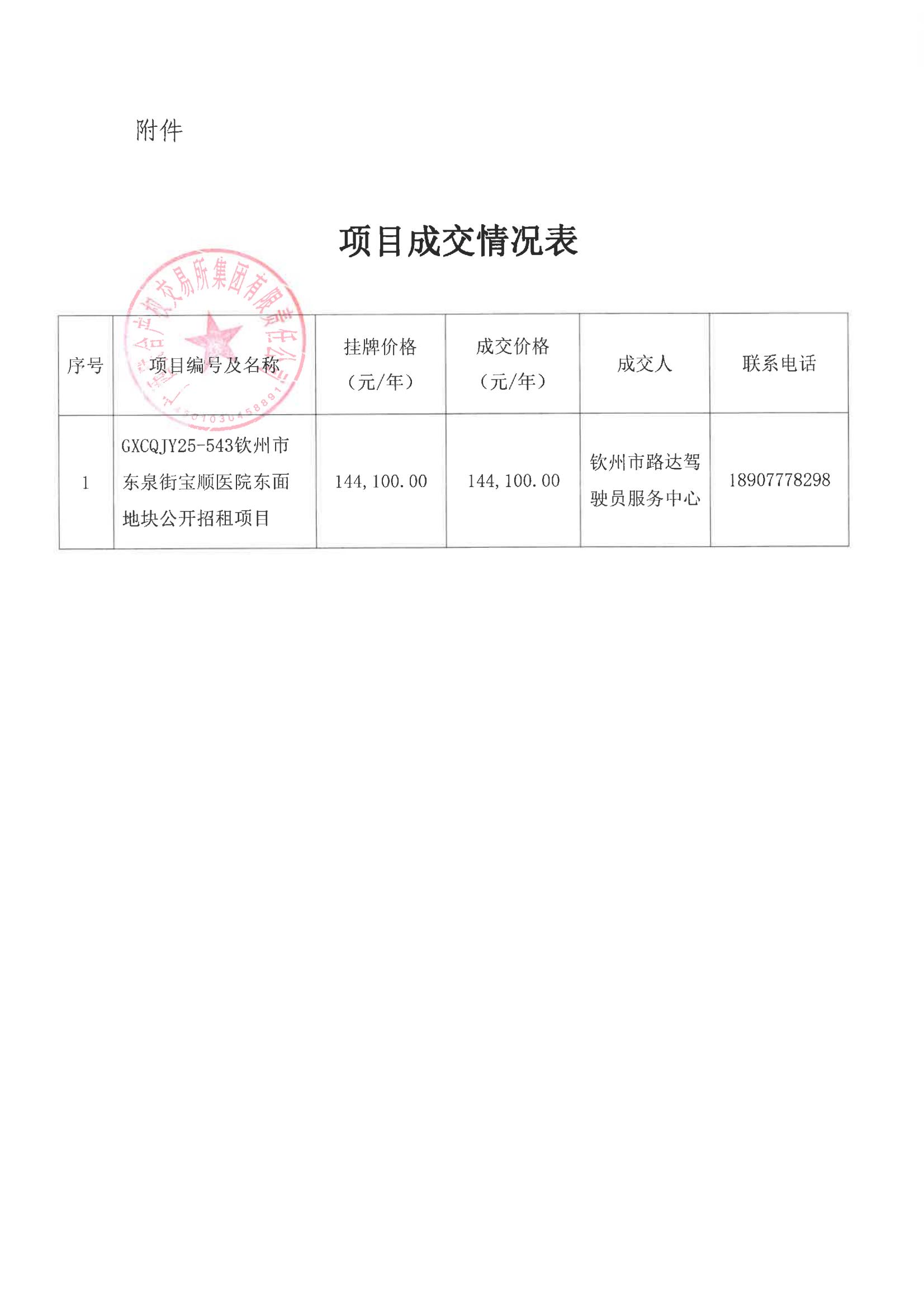 關(guān)于欽州市東泉街寶順醫(yī)院東面地塊公開招租項目成交情況的函