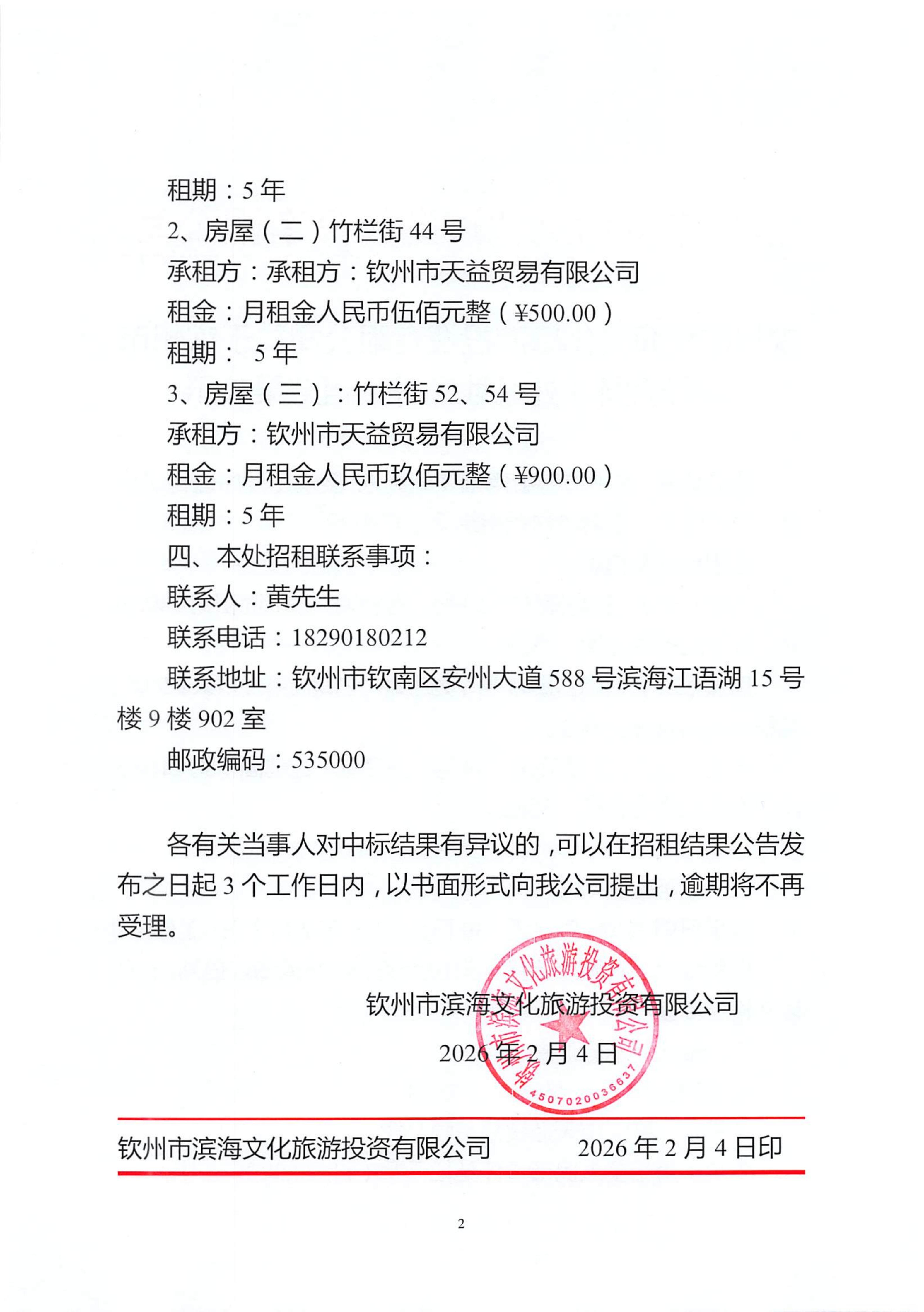 欽州市濱海文化旅游投資有限公司關(guān)于欽州市老街范圍3處公房公開招租結(jié)果公示(三馬路57、59號,竹欄街44號,竹欄街52、54號)