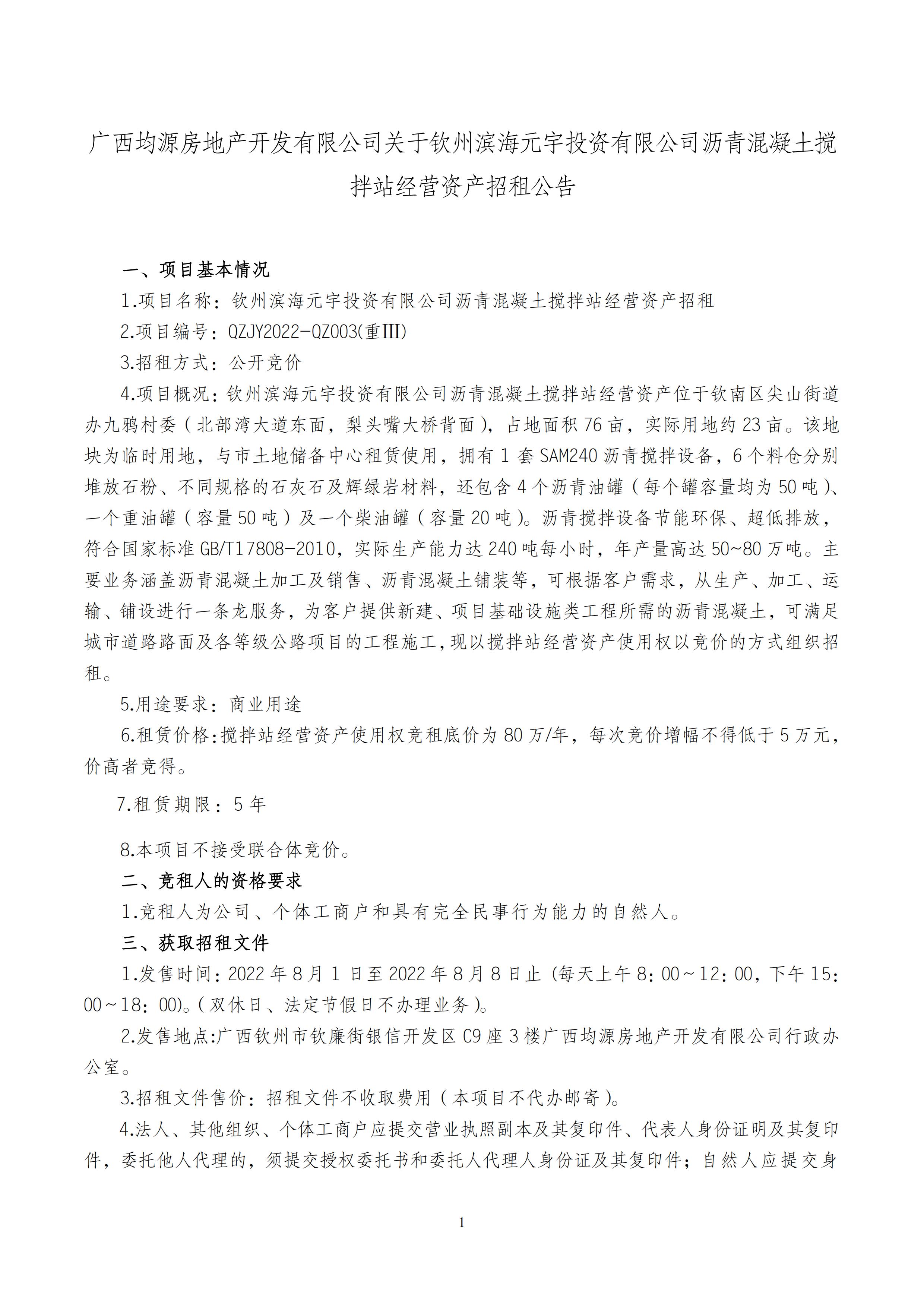 1.項目名稱:欽州濱海元宇投資有限公司瀝青混凝土攪拌站經(jīng)營資產(chǎn)招租