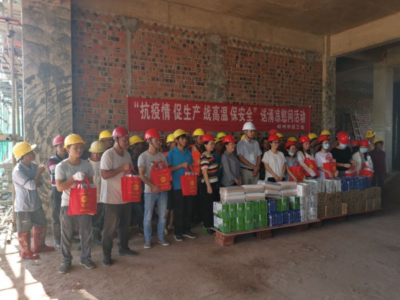 7月13日,欽州市總工會調(diào)研員黃春雯等一行到我集團(tuán)公司負(fù)責(zé)建設(shè)的欽州是茅尾海監(jiān)控監(jiān)測管理基地項(xiàng)目現(xiàn)場,開展“抗疫情 促生產(chǎn) 戰(zhàn)高溫”送清涼慰問活動。在炎炎夏日,為現(xiàn)場辛勤勞作的農(nóng)民工獻(xiàn)上一份清涼。致謝每一位在一線工作的人員,感謝他們?yōu)槲覀兂鞘邪l(fā)展貢獻(xiàn)一份力量。