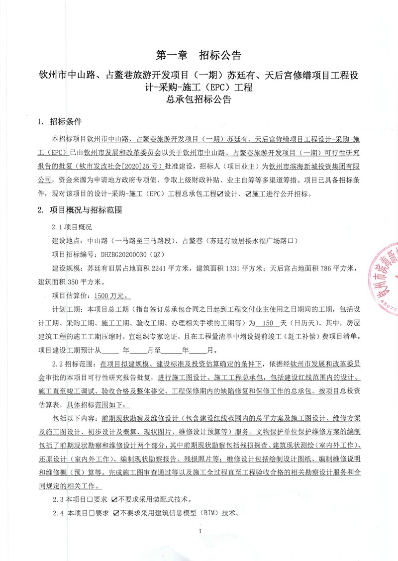 欽州市中山路、占鰲巷旅游開發(fā)項目(一期)蘇廷有、天后宮修繕項目工程設計-采購-施工(EPC)工程總承包招標公告
