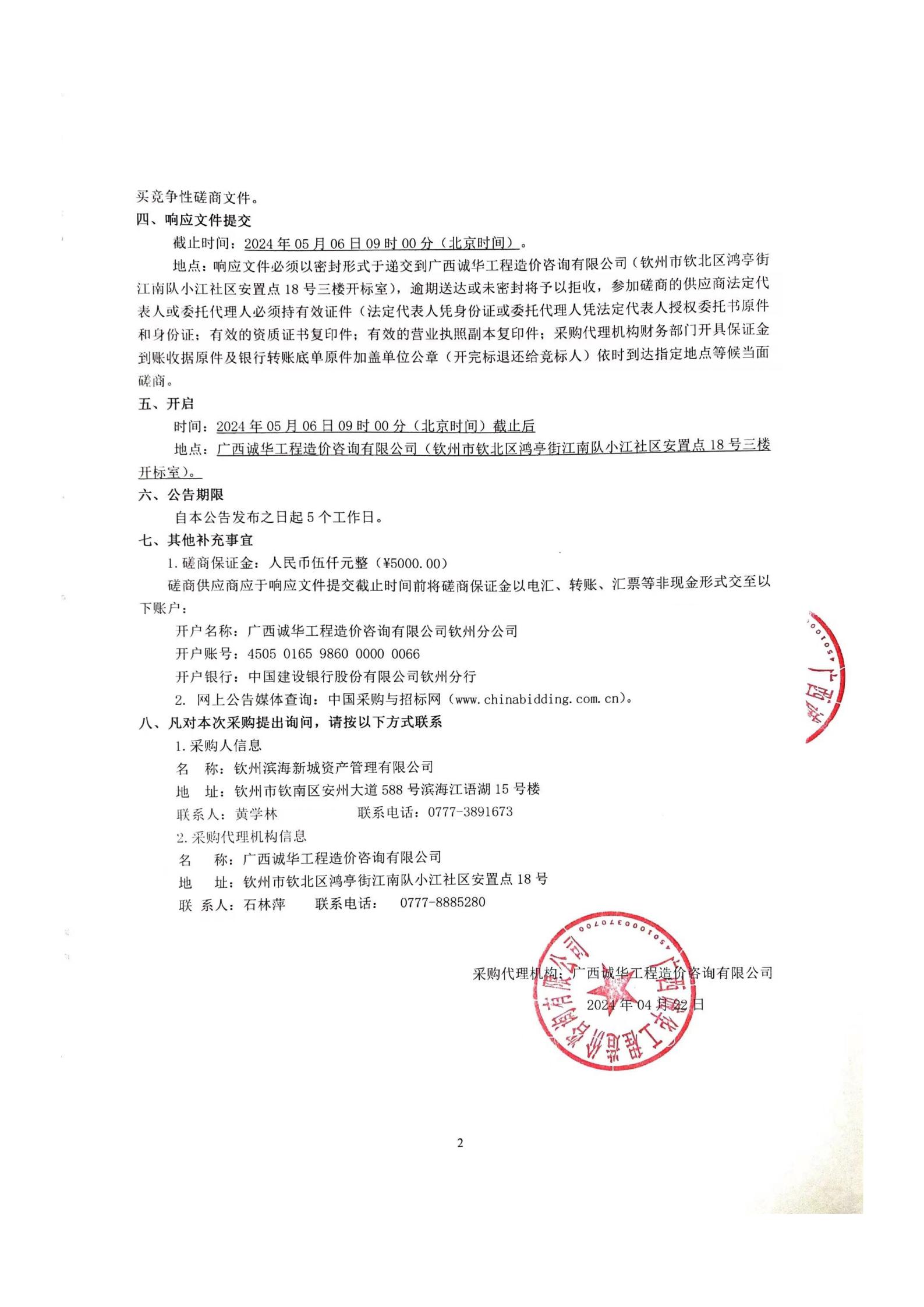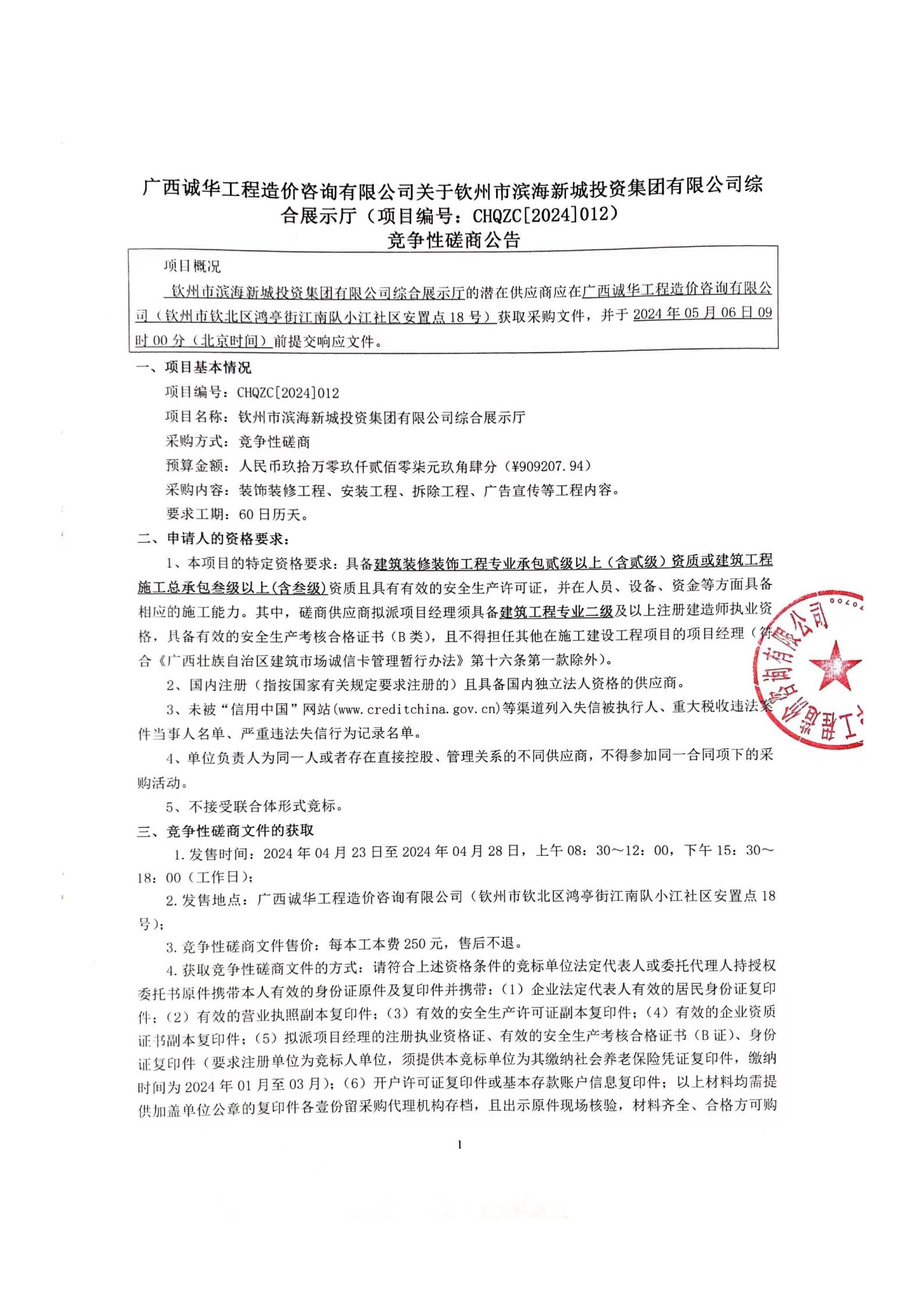 欽州市濱海新城投資集團有限公司綜合展示廳競爭性磋商公告