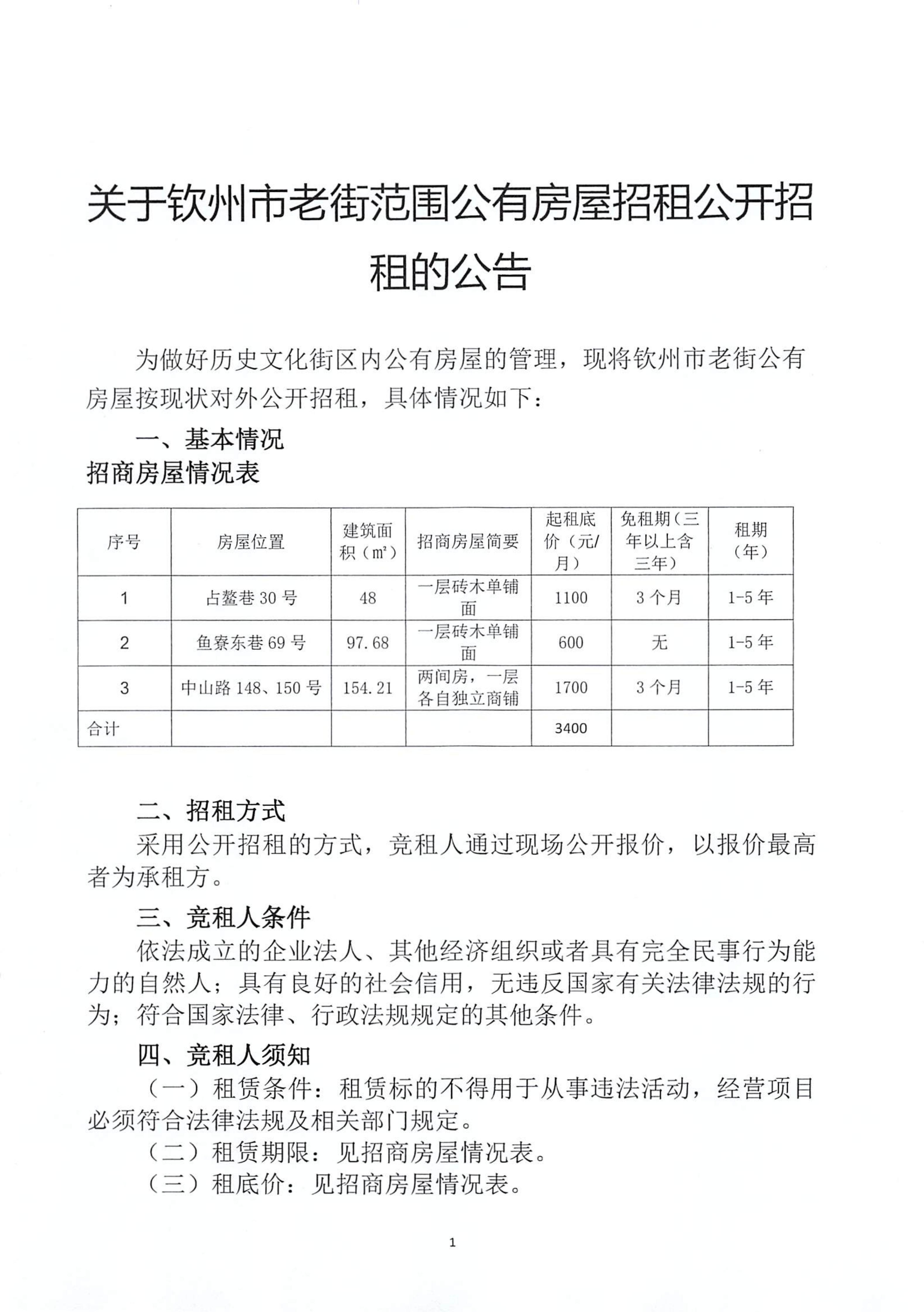 欽州市老街范圍共有房屋招租公開招租公告
